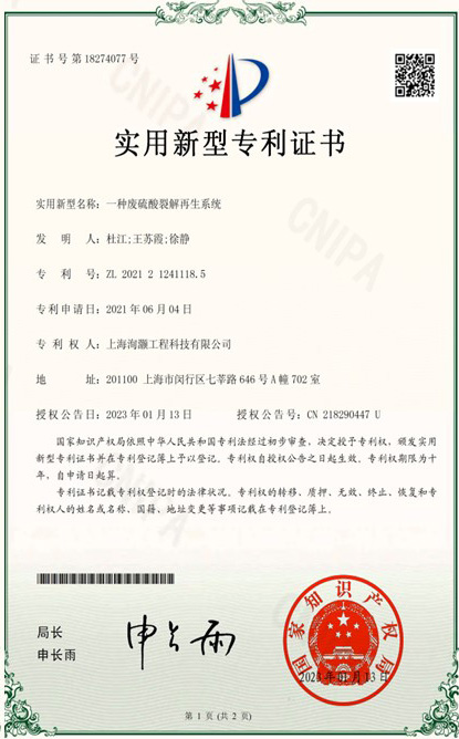 一种废硫酸裂解再生系统 专利号:ZL 202121241118.5
