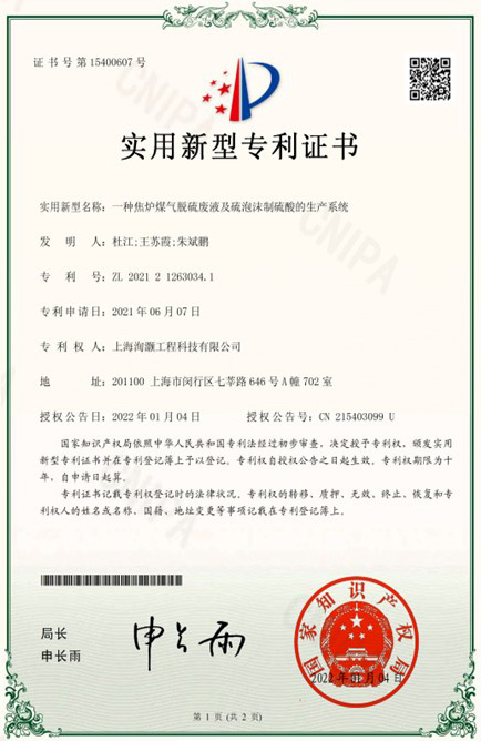 一种焦炉煤气脱硫废液及硫泡沫制硫酸的生产系统 专利号:ZL 202121263034.1